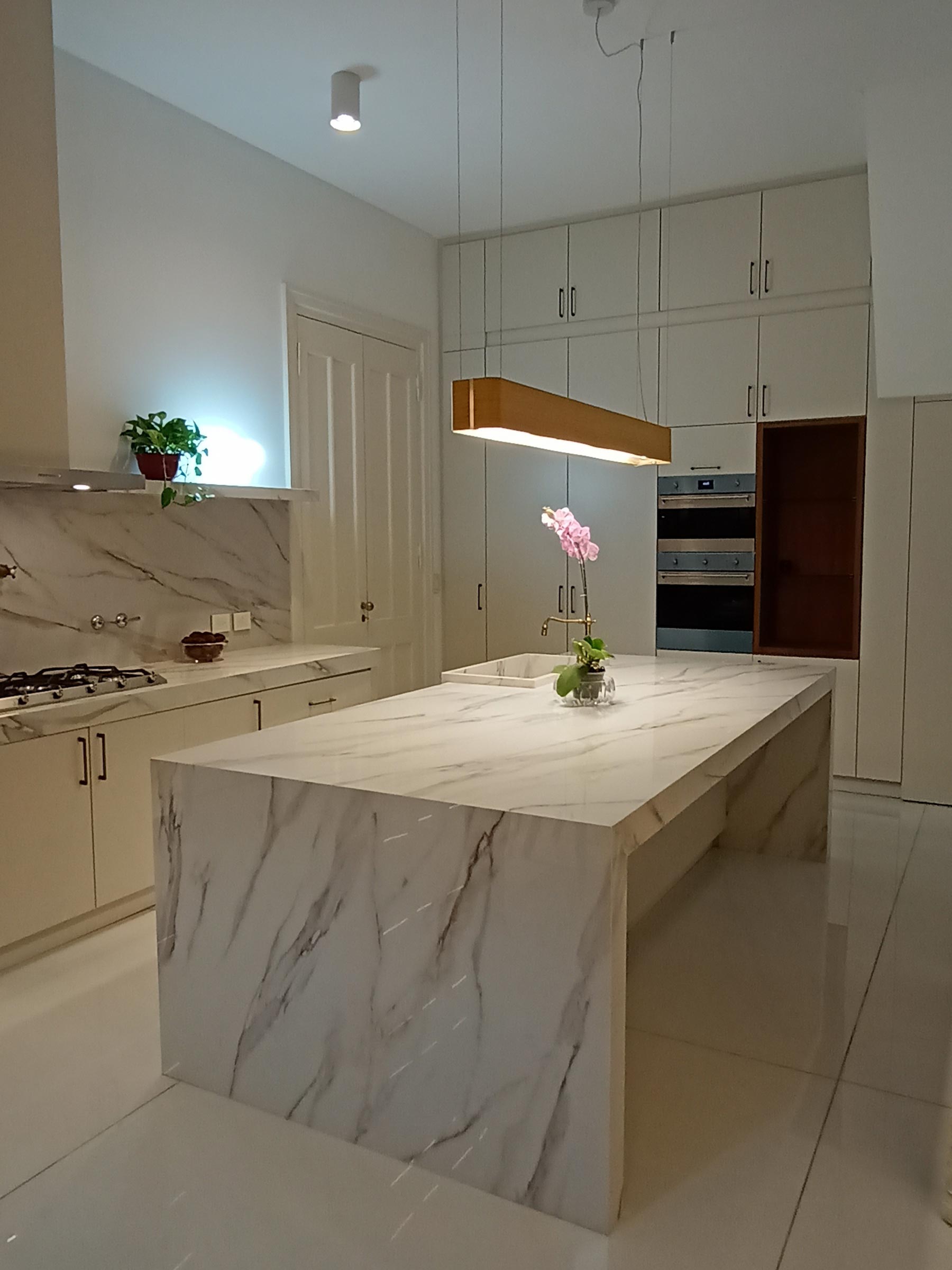 Un espacio con un toque distintivo que lo hiciera único. Nuestra colección Star (12mm) de la línea mármol para encimeras y los detalles (6mm) reemplazaron el material original para una mayor resistencia, higiene y versatilidad, sin dejar de lado el diseño. Se generó un amable contraste con nuestro clásico Blanco Pleno Pulido.